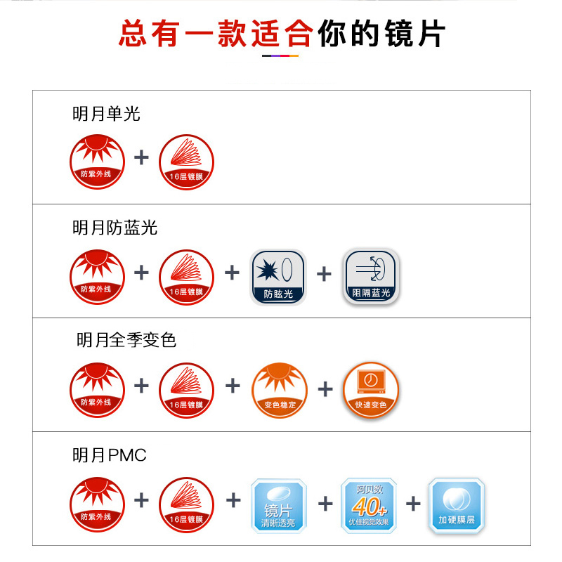 Bright moon lens 1 60 Aspherical anti-blue light 1 71 Color-changing glasses 1 74 Ultra-thin myopia eyeglasses 1 67