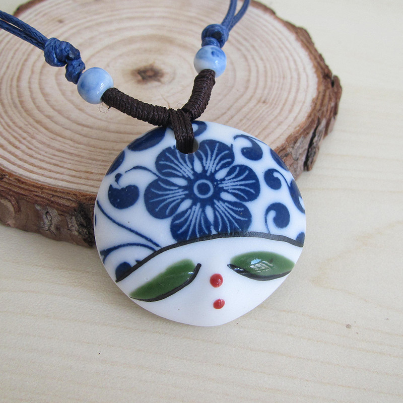 Ethnic blue and white porcelain hand-painted doll head ceramic jewelry necklace pendant women's sweater chain long version stall