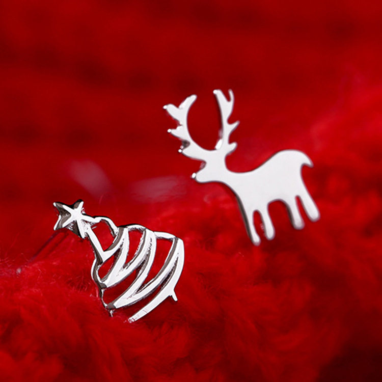 s925 Sterling Silver Fawn Deer Christmas Tree Asymmetric Ear Pins Women