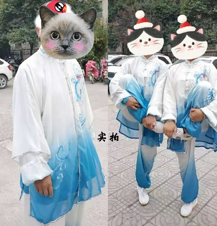 Gradient blue and white transition color embroidery Xiaoqinglong Taiji suit for men and women training clothes martial arts performance clothes three-piece suit