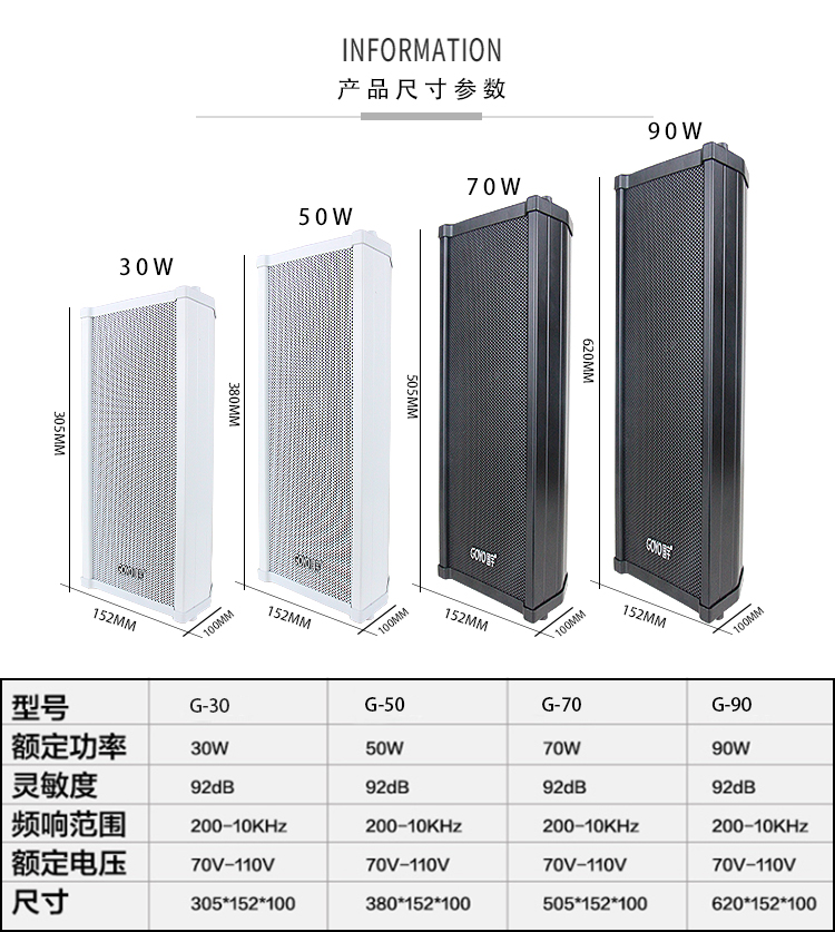White 30W Outdoor Waterproof Sound Column Black 30W Outdoor Waterproof Sound Column White 50W Outdoor Waterproof Sound Column Black 50W Outdoor Waterproof Sound Column White 70W Outdoor Waterproof Sound Column Black 70W