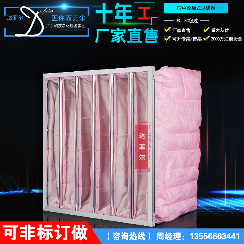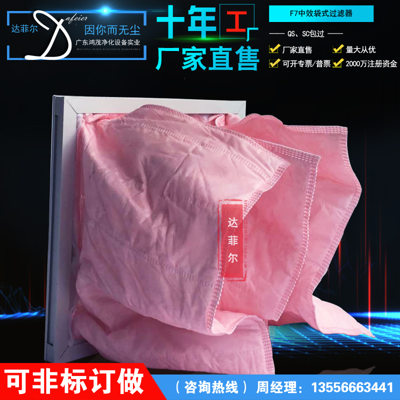F7 class efficient bag type filter large air volume resistance low unwoven cloth air filter bag type filter screen