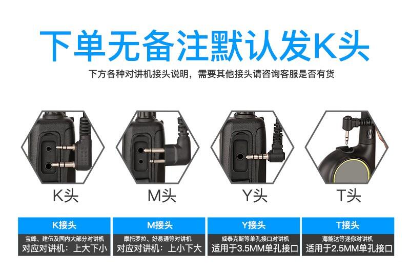 K head Default white Black to note M head Default hair white Black to note Y head Carefully shoot To contact customer service to confirm T head 2.5MM three sections Default white T head 2.5MM four-section screw mouth dedicated Xiaomi walkie-talkie special connector