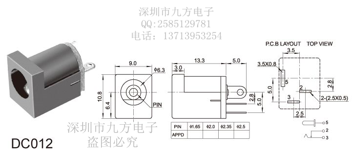 DC-012 DC power DC socket 5 5 * 2 5MM DC005 180 degrees foot three-foot vertical round needle