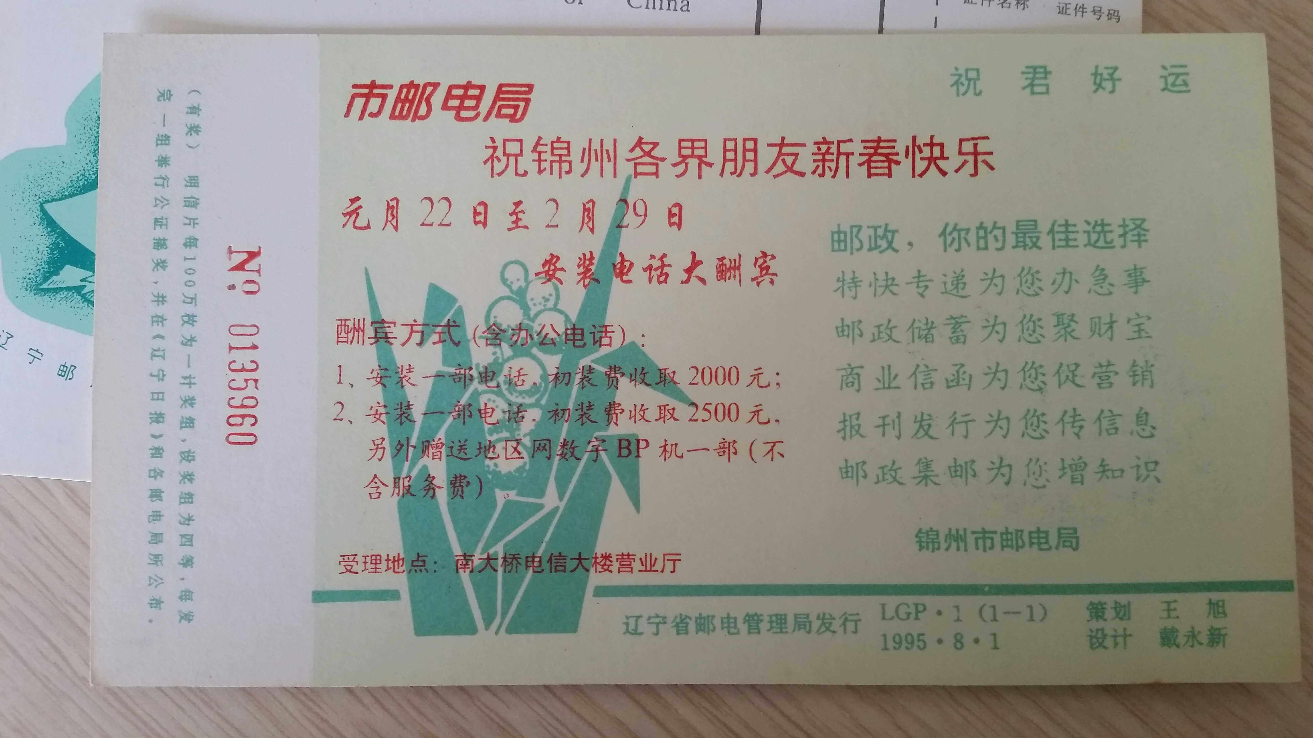 1995 China Post Advertising with Prize Postcard No postage Liaoning Province Posts and Telecommunications Authority to issue