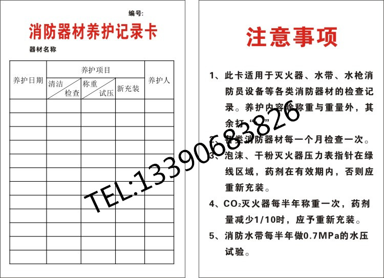 Factory price direct sales fire extinguisher inspection card fire equipment maintenance record card check card with plastic hard card set