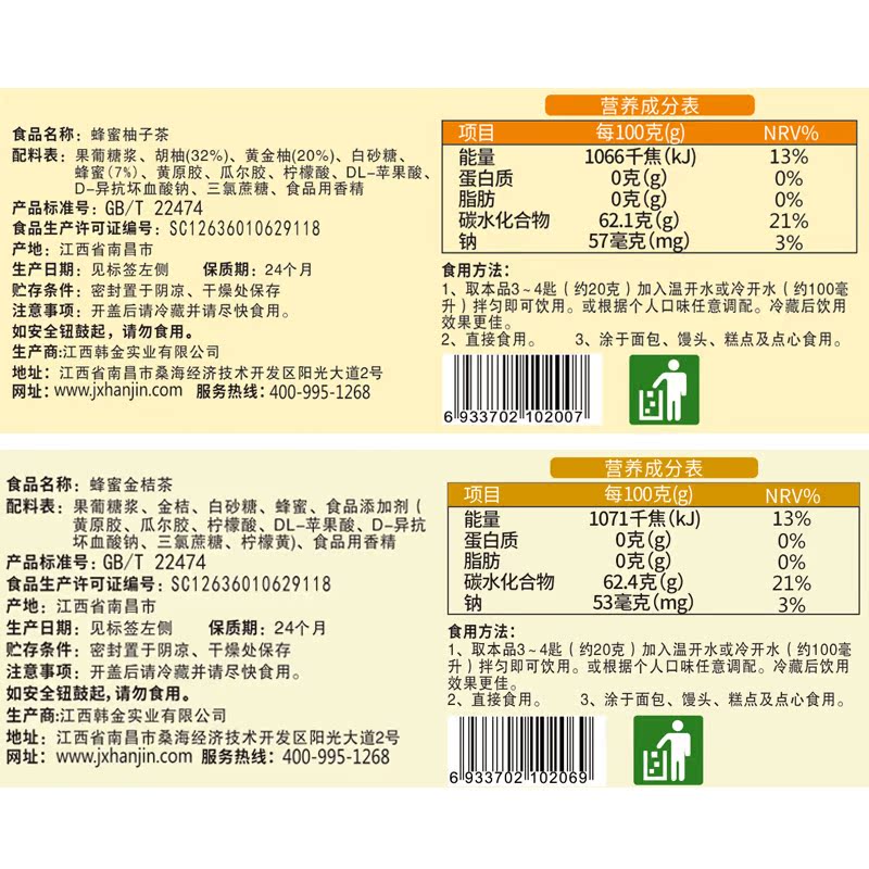 East Dae Han Jin Honey Pomace Tea Golden Orange Tea Jam 500g * 2 bottles of water jam tea pulp Pulp Milk Tea Raw Material