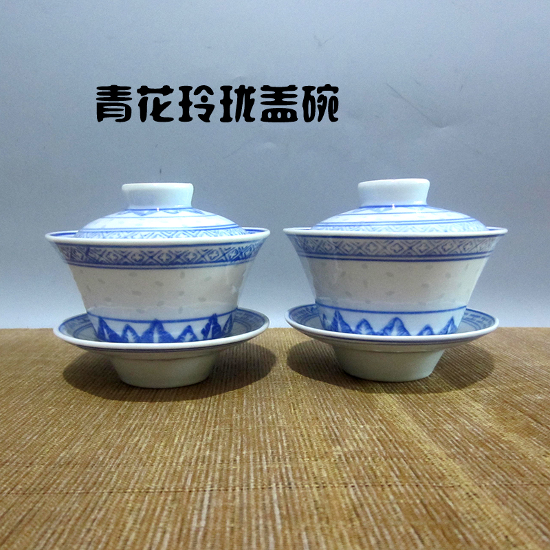 Jingdezhen Cultural Revolution factory goods porcelain Guangming Porcelain Factory Blue and white exquisite three-cai Gaiwan old tea bowl collection bag old