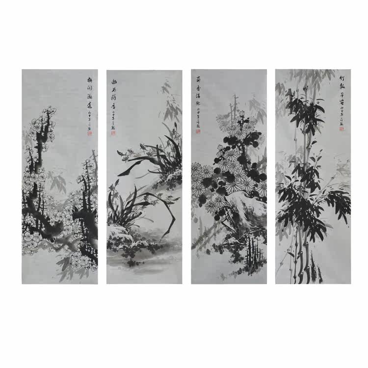 Melan Bamboo Chrysanthemum Hanging Painting Office Decoration Country Painting Four Screens Flowers Birds New Chinese Style Sofa Background Wall Quadrillian Mural Painting