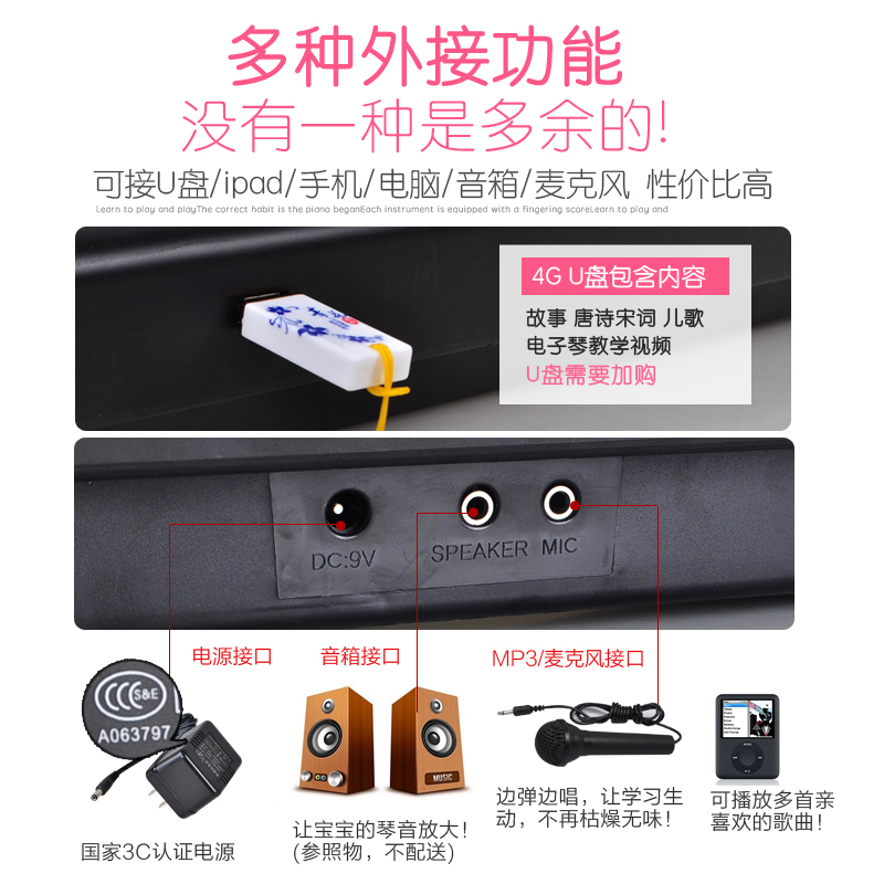 Mobile phone can be connected to send 3C power supply + simple music score + tutorial + microphone can be connected to the mobile phone U disk send 3C power supply + color score + tutorial + microphone can be connected to the mobile phone U disk send 3C power supply + color score + tutorial + microphone + high-grade tassel cover can be connected to the mobile phone U disk send 3C power supply + color score + tutorial + microphone + piano holder + piano sticker can be connected to the mobile phone U disk send 3C power supply + color score + tutorial + microphone + tassel cover + piano stand + piano stool