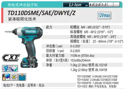TD110DSAE(12V2 0AH battery) TD110DSME(12V4 0AH battery) TD110DWYE 12V 1 5A