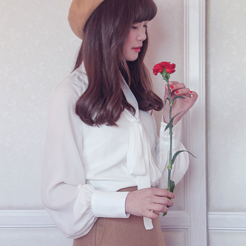 Miss Lü Snow spinning Shirt woman 2022 Spring and autumn swarm with waist and white shirt V collar lacing lantern sleeves Bottom Shirts