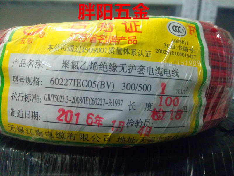 Wuxi Jiangnan Five-color cable national standard BV1 squared single stock pure copper core hardwire home assembly line power cord 100 m