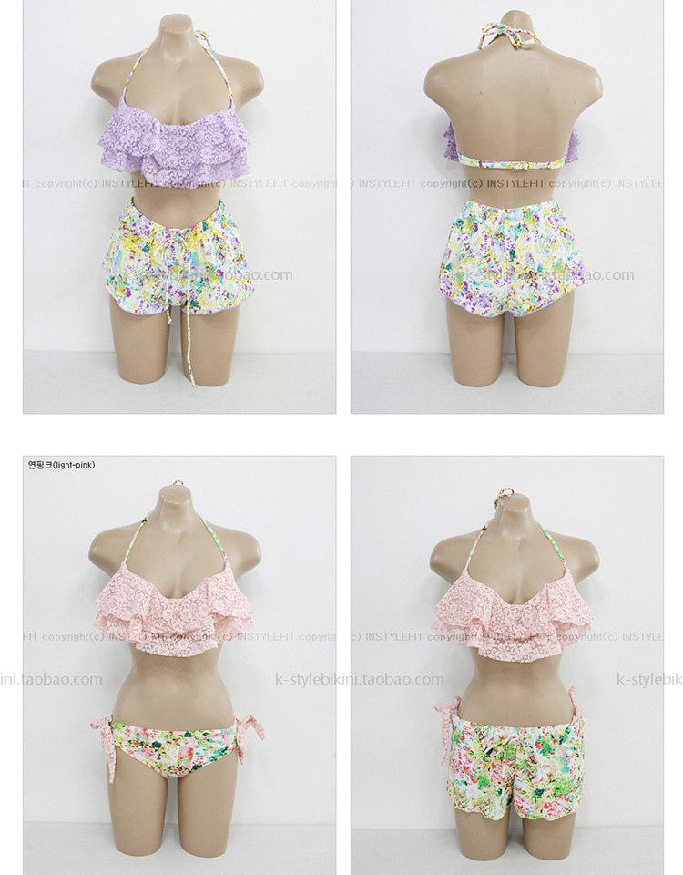 South Korea's new lace small cute printed bikini two-piece large breasted breast steel entrusted with spa swimsuit Three sets