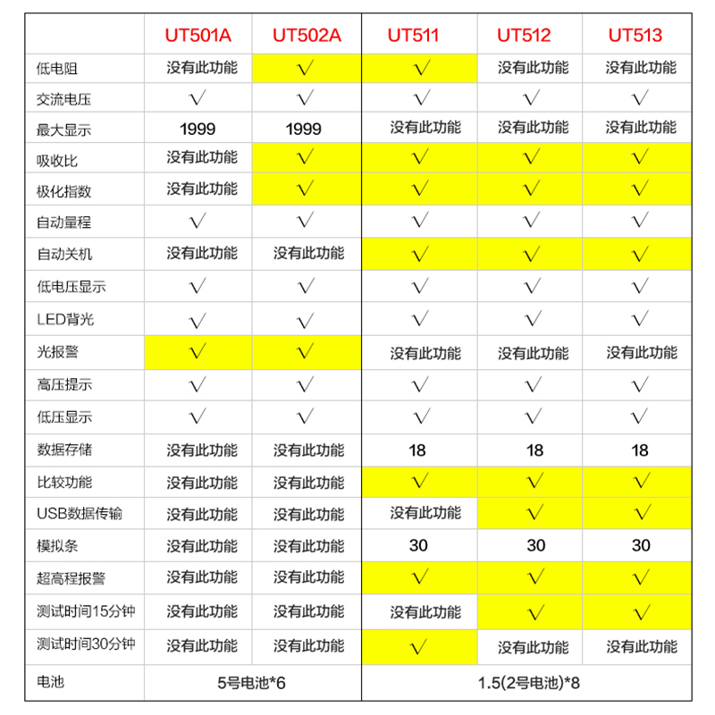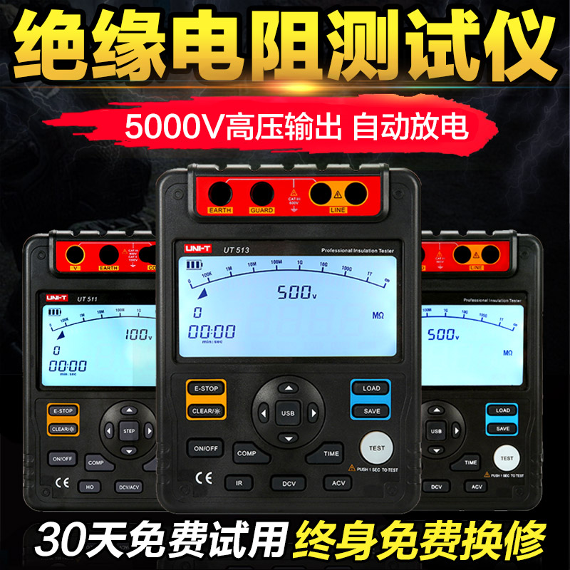 ET-500A Special Edition 1000V(250V 500V 750V 1000V) Send Clamp Table UT501A(UT5100) Professional Edition 1000V(100V 250V 500V 1000V) Send Clamp Table UT501C New Edition 1000V(100V 250V 500V 1000V) ET-502A (UT502A Same) Special Edition 1000V(250V 500V 750V 1000V) Pincer Table UT502A Professional Edition 2500V(500V 1000V 2500V) Clamp Table UT502C New Edition 2500V(500V 1000V 2500V) Clamp Table UT511 Large Screen Intelligent Expert Edition 1000V 100V-1000V Clamp Table UT512 Large Screen Intelligent Expert Edition 2500V (with data cable) 500V-2500V Clamp Table UT513 Large Screen Intelligent Expert Edition 5000V (with data cable) 500V-5000V