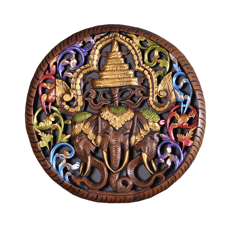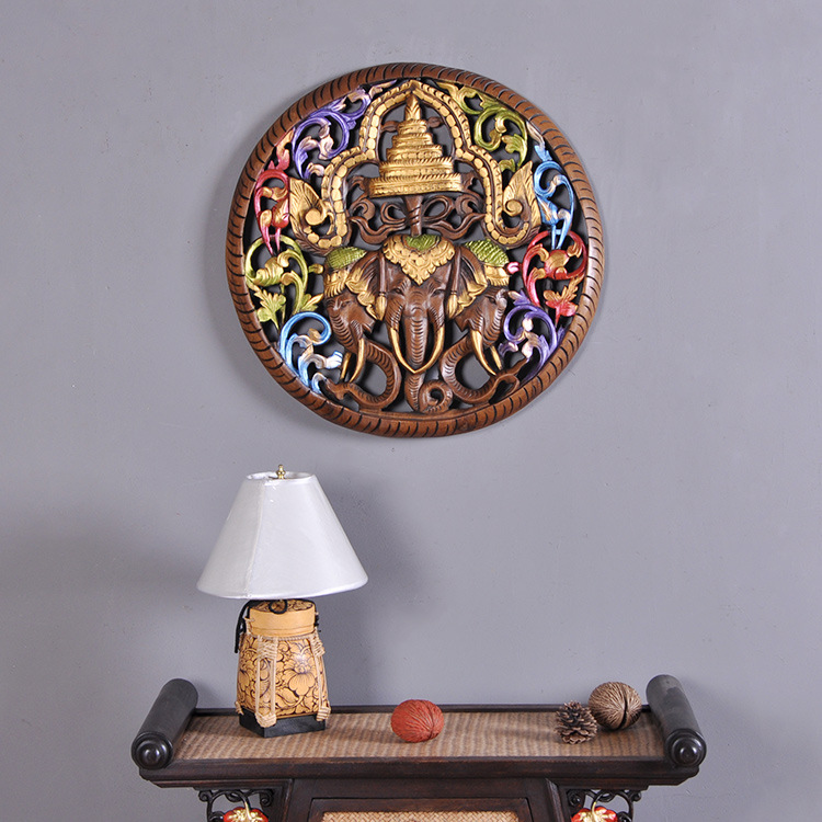 Thai carved board pendant Southeast Asian handmade Thai teak wood carving Wall decoration Elephant Trunk God of Fortune carved board