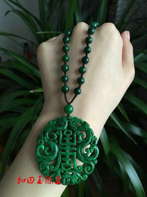 Myanmar dry green Tie Longsheng pendant for men and women Yang green jade hollow Wanshou brand pendant jade necklace