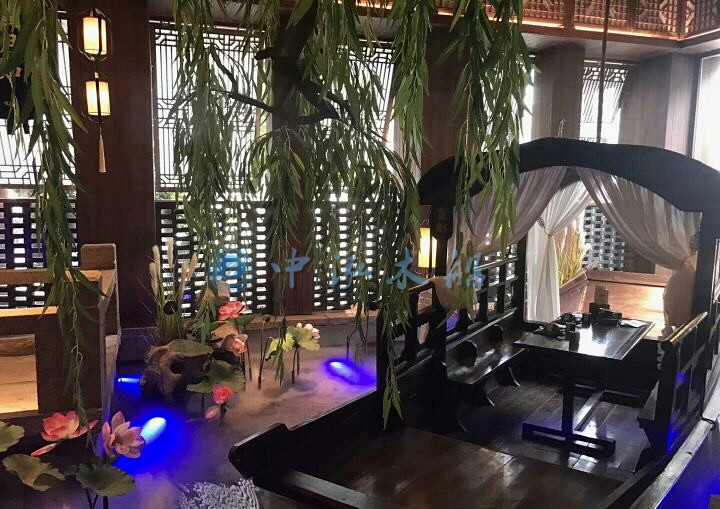 New listed Decorative Wooden Boat Imitation Ancient Dining Room Catering Ship Handmade Solid Wood Quality Sightseeing Boat Track With Swatted Ocanopy Boat