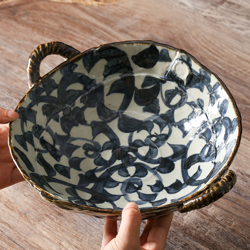 Japan imports a Japanese grass fruit disk hand-drawn Tang grass bucket Japanese vintage belt with two ear large salad bowl