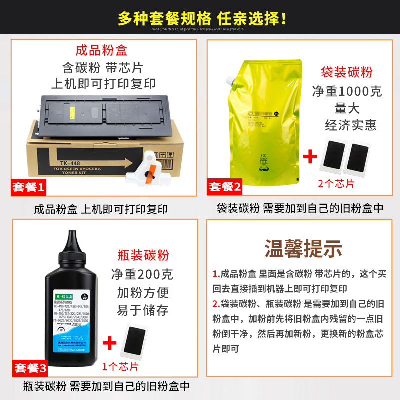 TK448 toner box (finished toner box, ready-to-use, print 7200 pages), bagged toner 1000g (with 2 TK448 chips), toner 200g (with 1 T