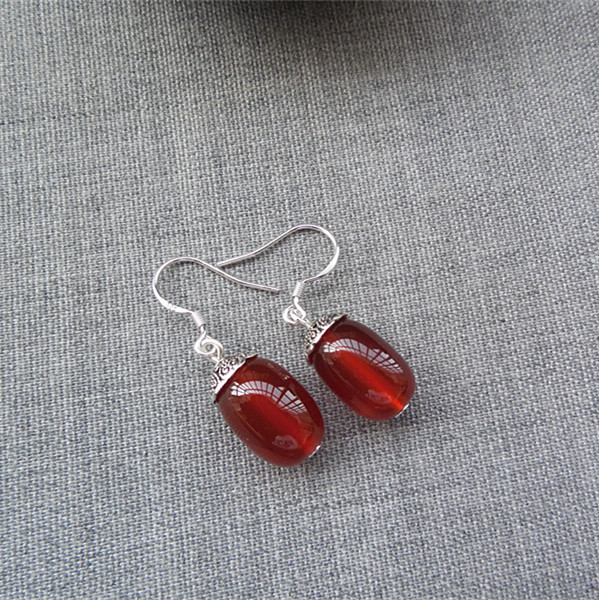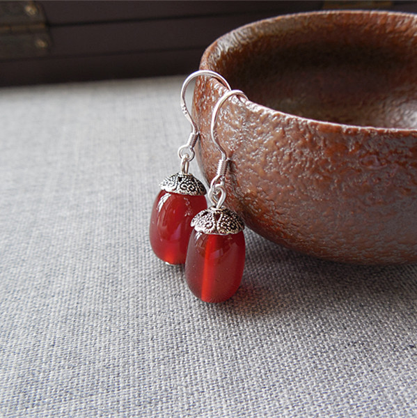 Ethnic style high-quality red agate crystal barrel beads ladies earrings retro court hypoallergenic sterling silver ear hook earrings earrings