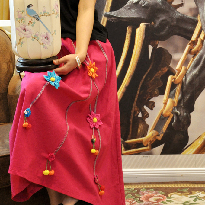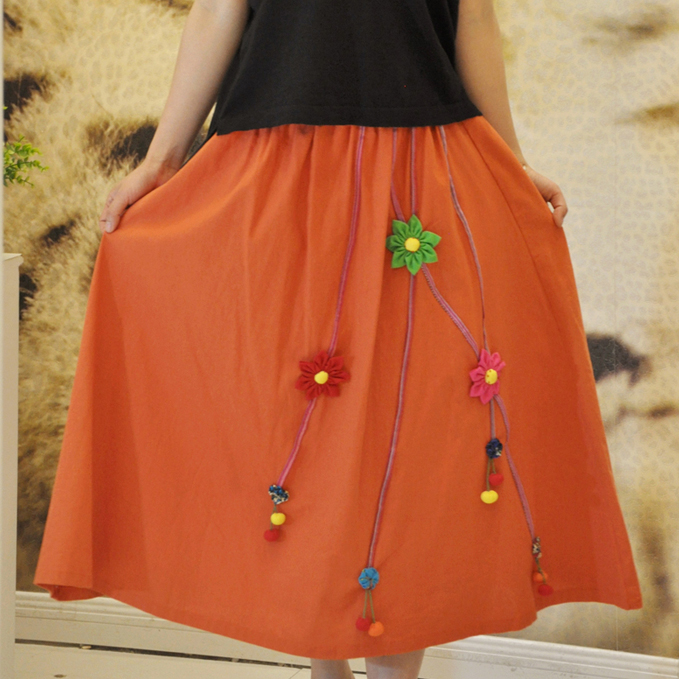 New summer and autumn Chinese national style cotton and linen retro embroidery flower skirt long skirt elastic waist big swing skirt female