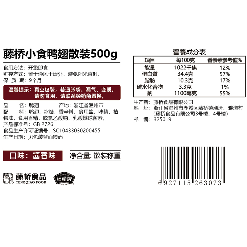 (Rattan bridge brand)Zhejiang Wenzhou specialty Rattan bridge sauce duck wings snacks Duck wings weighing 500g casual snacks