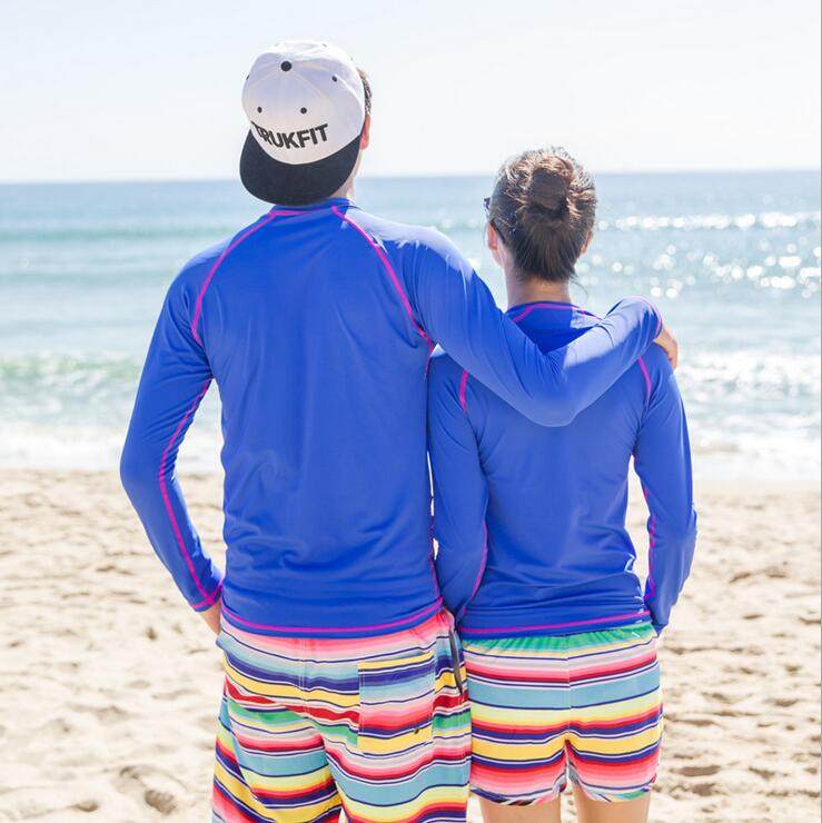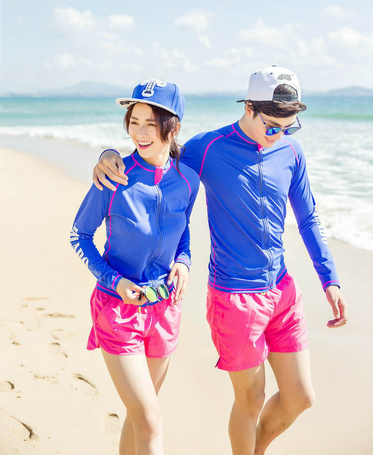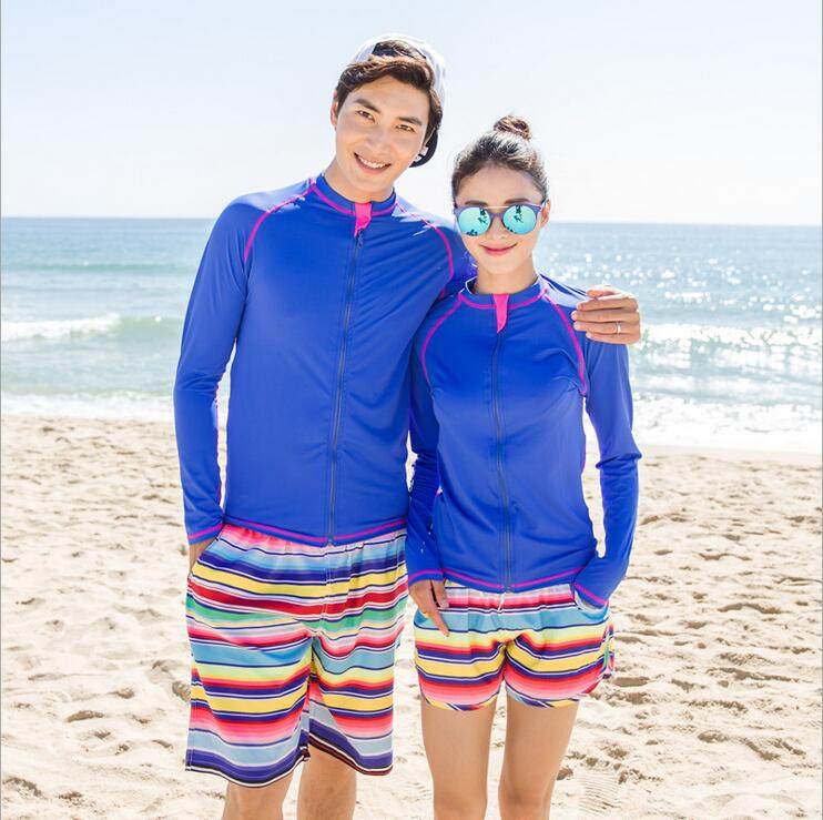 New couple long-sleeved blue surf suit sun protection tight sports fitness conservative cover belly quick-drying snorkeling swimsuit
