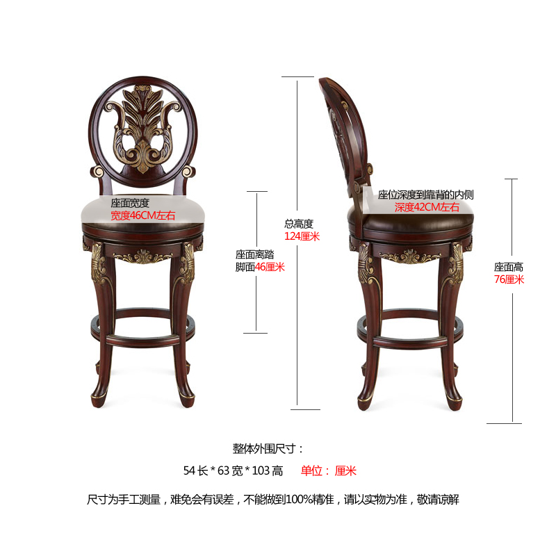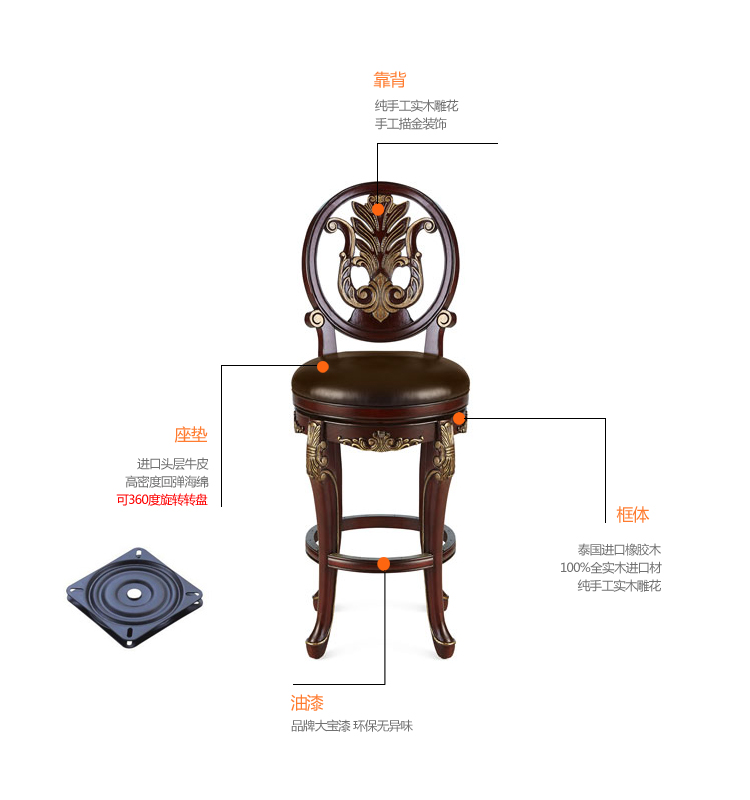 European - style leather bar chair solid wood carved floral depiction of golden leather bar chair luxurious American high chair