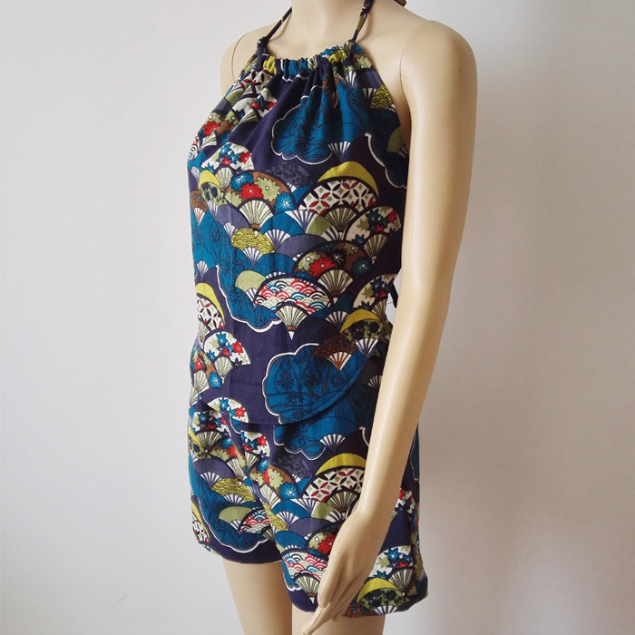 Women's sexy belly warm retro folding fan printing pattern cotton and hemp home pajamas Belly suit pajamas
