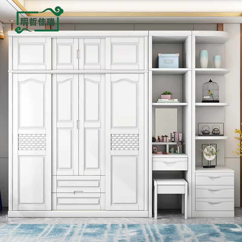 Modern simple white solid wood wardrobe four doors sliding door with top oak wardrobe push-pull bedroom AAF6-99D9