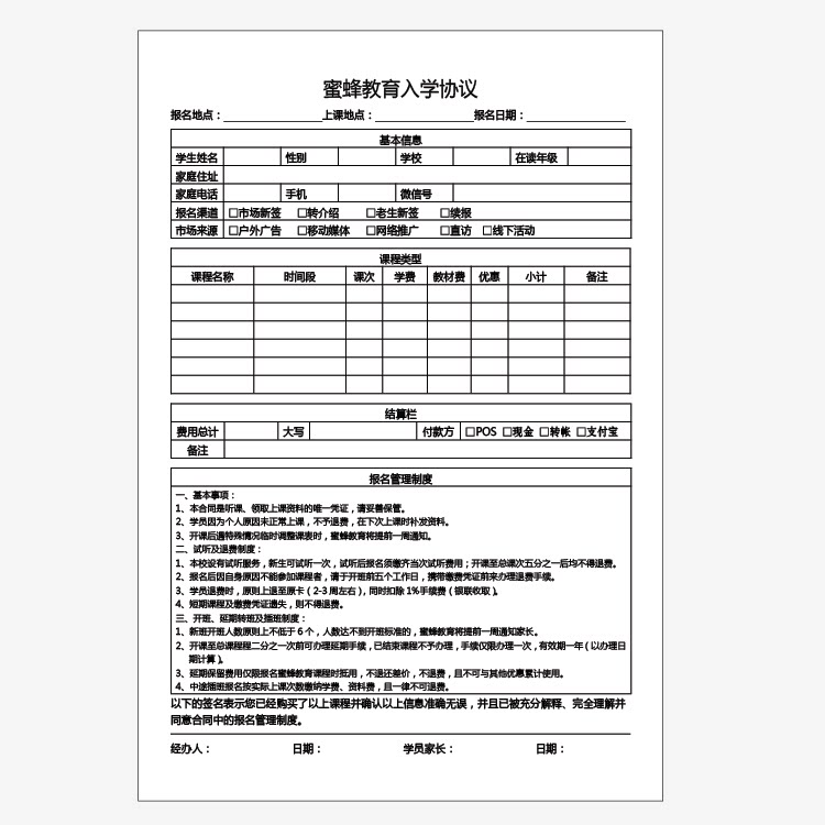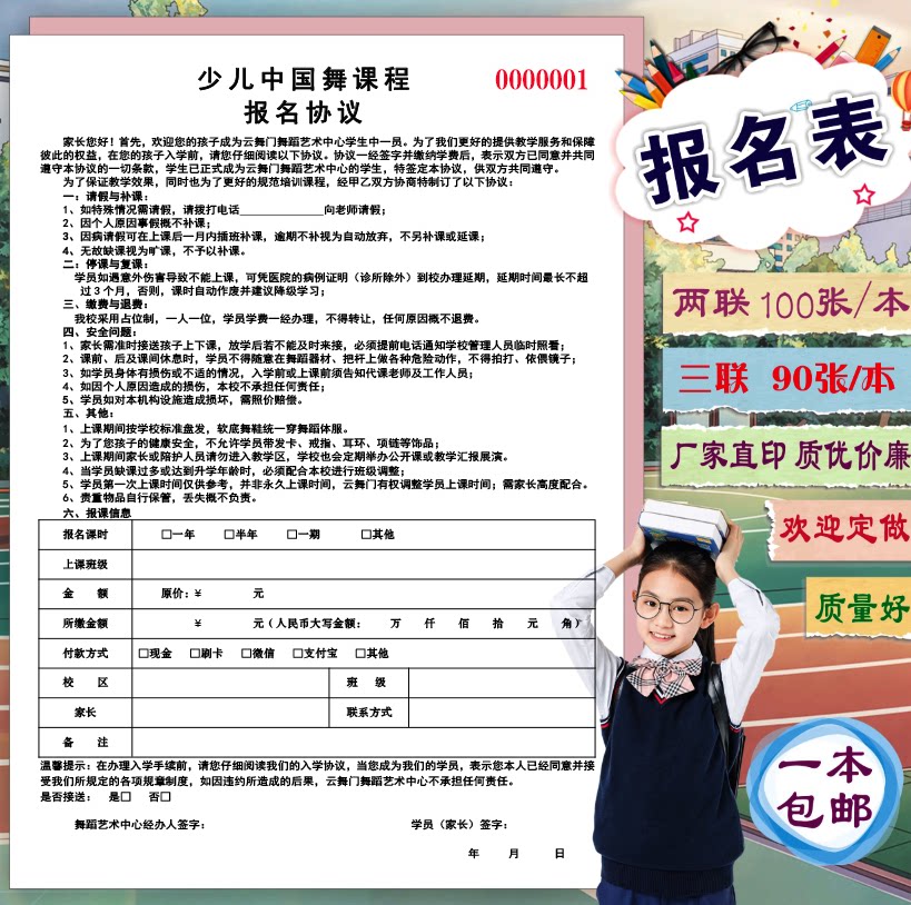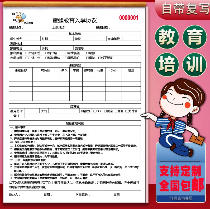 Custom Art Art Entrance Course Agreement Sign Up Training Course Institution Receipt School Trainees Registration Contract