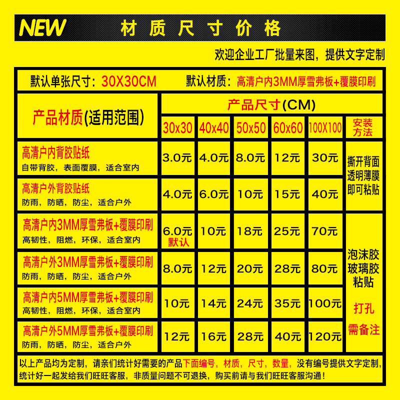 Indoor PP HD adhesive sticker Outdoor PP HD adhesive sticker Indoor 3MM thick Scheffer board PVC material Outdoor 3MM thick Scheffer board PVC material Indoor 5MM thick Scheffer board PVC