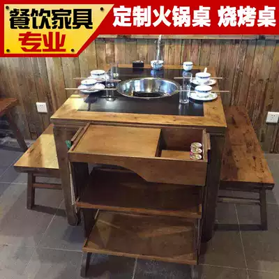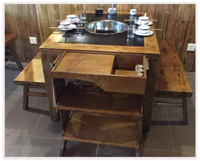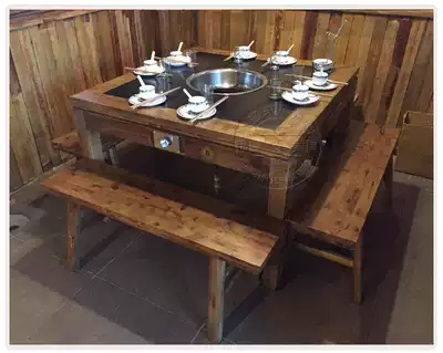 Custom solid wood hot pot table Antique inlaid fire stone hot pot table Barbecue table Charcoal wood induction cooker hot pot table and chair