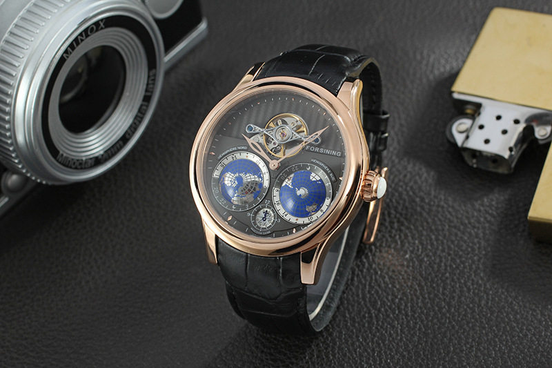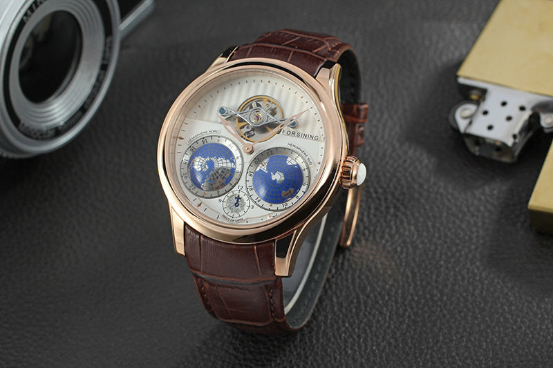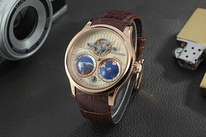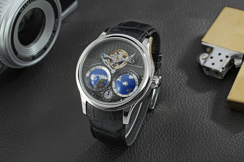 FORSINING Small Map Flywheel Fake Eye Steel Shell Tri - pin Automatic Mechanical Belt Watch D310