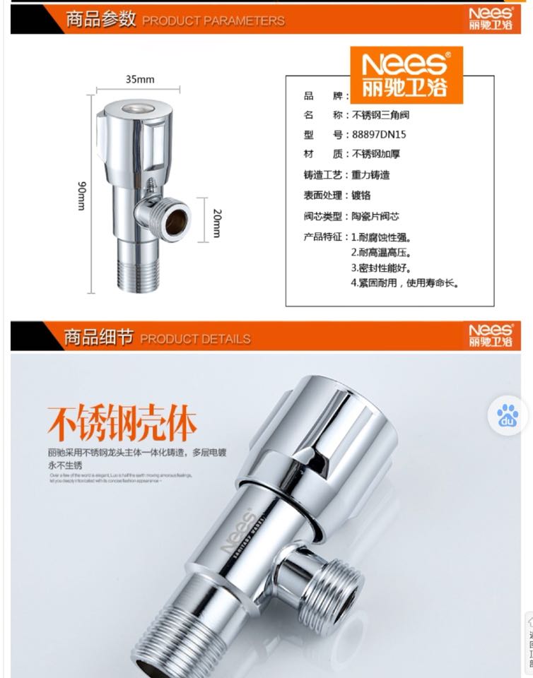 Lichi Stainless Steel Triangle Valve DN15 Fine Steel Heavier ceramic sheet valve core