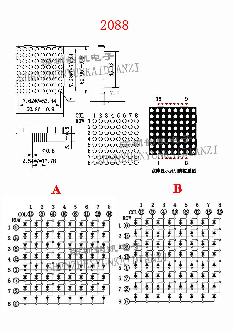 5mm16foot 8*8 red dot matrix module 2088AS 2088BS 2388 dot array LED dot match module F5
