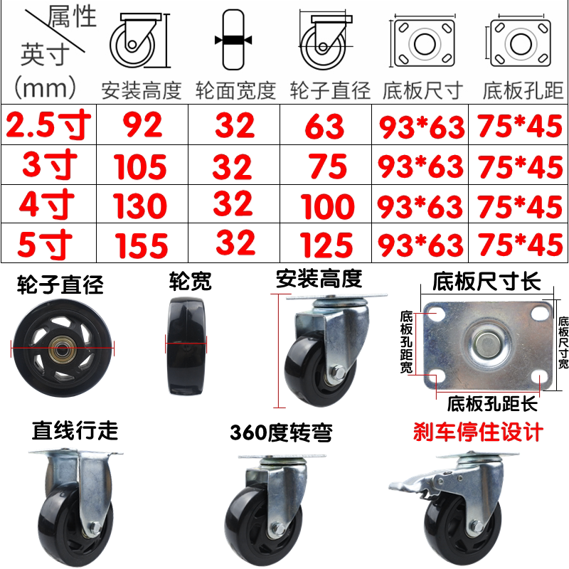 2 5-inch flat directional wheels2 5-inch flat-panel universal wheels2 5-inch flat-plate brake wheels3-inch flat-plate directional wheels3-inch flat-panel universal wheels3-inch flat-brake wheels4-inch flat-plate directional wheels4-inch flat-panel wheels