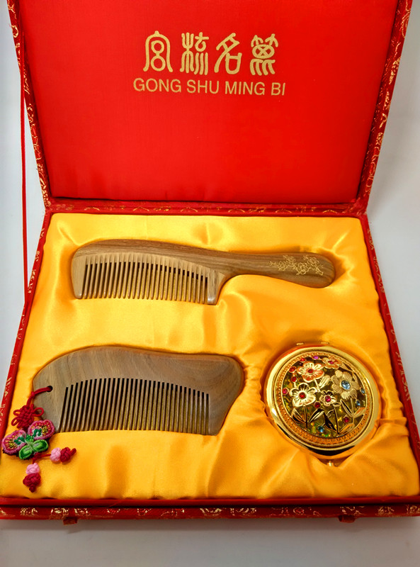 Changzhou Special Production Comb Grate Natural Green Sandalwood Comb Mirror Brocade Box Three Sets Birthday Memorial Gift Box Suit-Taobao