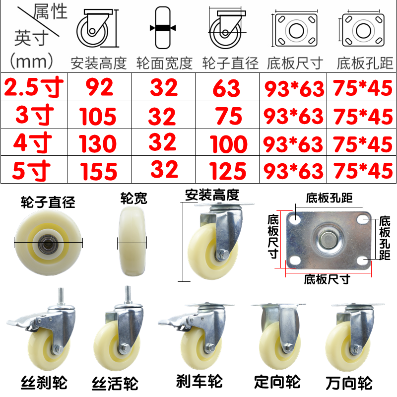 2 5-inch flat directional wheels2 5-inch flat-panel universal wheels2 5-inch flat-panel brake wheels3-inch flat-plate directional wheels3-inch flat-panel universal wheels3-inch flat-brake wheels4-inch flat-panel directional wheels4-inch flat-panel wheels