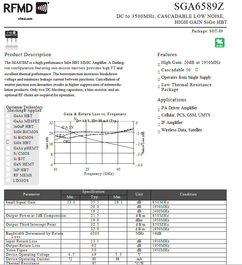 SGA6589Z SGA6589 Screen printing A65 A65Z SOT89 RF low noise power amplifier tube
