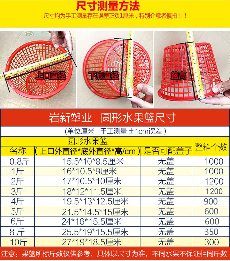 Contact customer service to reduce postage and then pay for strawberries Cherry Mulberry recommended to shoot the large two baskets are small to the size does not guarantee the number of pounds 0.8 pounds red 15.5 * 10 * 8.5cm (50) 0.8 pounds blue 15.5 * 10 * 8.5cm (50) 1 pound red 16 * 10.5 * 9cm (50) 1 pound blue 16 * 10.5 * 9 cm (50) 2 pounds red 17 * 10.5 * 10 cm (50) 2 pounds blue 17 * 10.5 * 10 cm (50 pcs). 3 kg red 18 * 12 * 11.5cm (50) 3 kg blue 18 * 12 * 11.5cm (50) 4 kg red 19.5 * 13 * 12.5cm (50) 4 kg blue 19.5 * 13 * 12.5cm (50) 5 kg red 21.5 * 14.5 * 15 cm (50) 5 kg blue 21.5 * 14.5 * 15 cm (50) 6 kg red 24 * 16 * 15.5 cm (50) 6 kg blue 24 * 16* 15.5cm (50pcs)8kg Red 25.5*19*15.5cm (50pcs)8kg Blue 25.5*19*15.5cm (50pcs)10kg Red 27*19*18.5cm (50pcs)10kg Blue 27*19*18.5cm (50pcs)