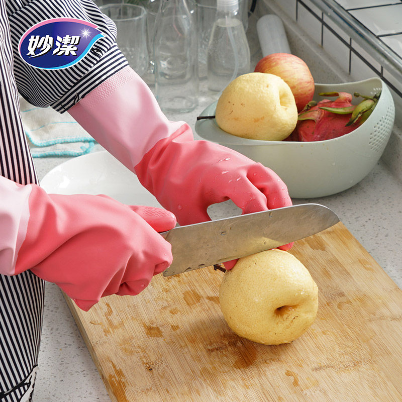 Miaojie household dishwashing laundry gloves kitchen housework cleaning spray velvet rubber waterproof gloves a pair of durable type