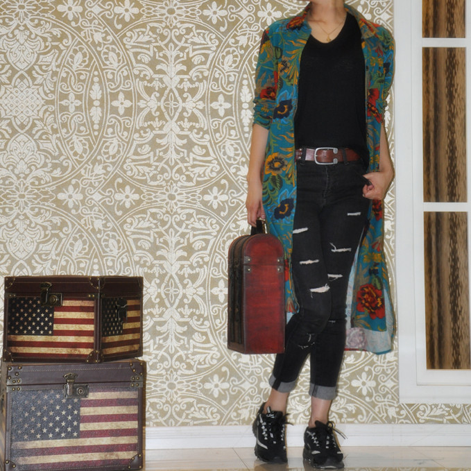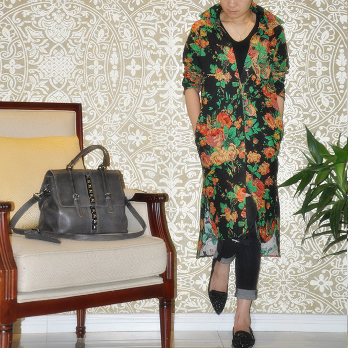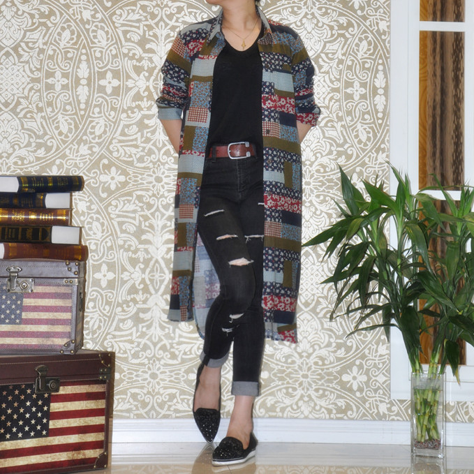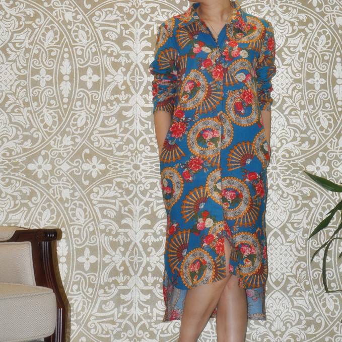 Cotton and linen shirt women's mid-length version new stand collar print retro ethnic linen loose large size women's long sleeves
