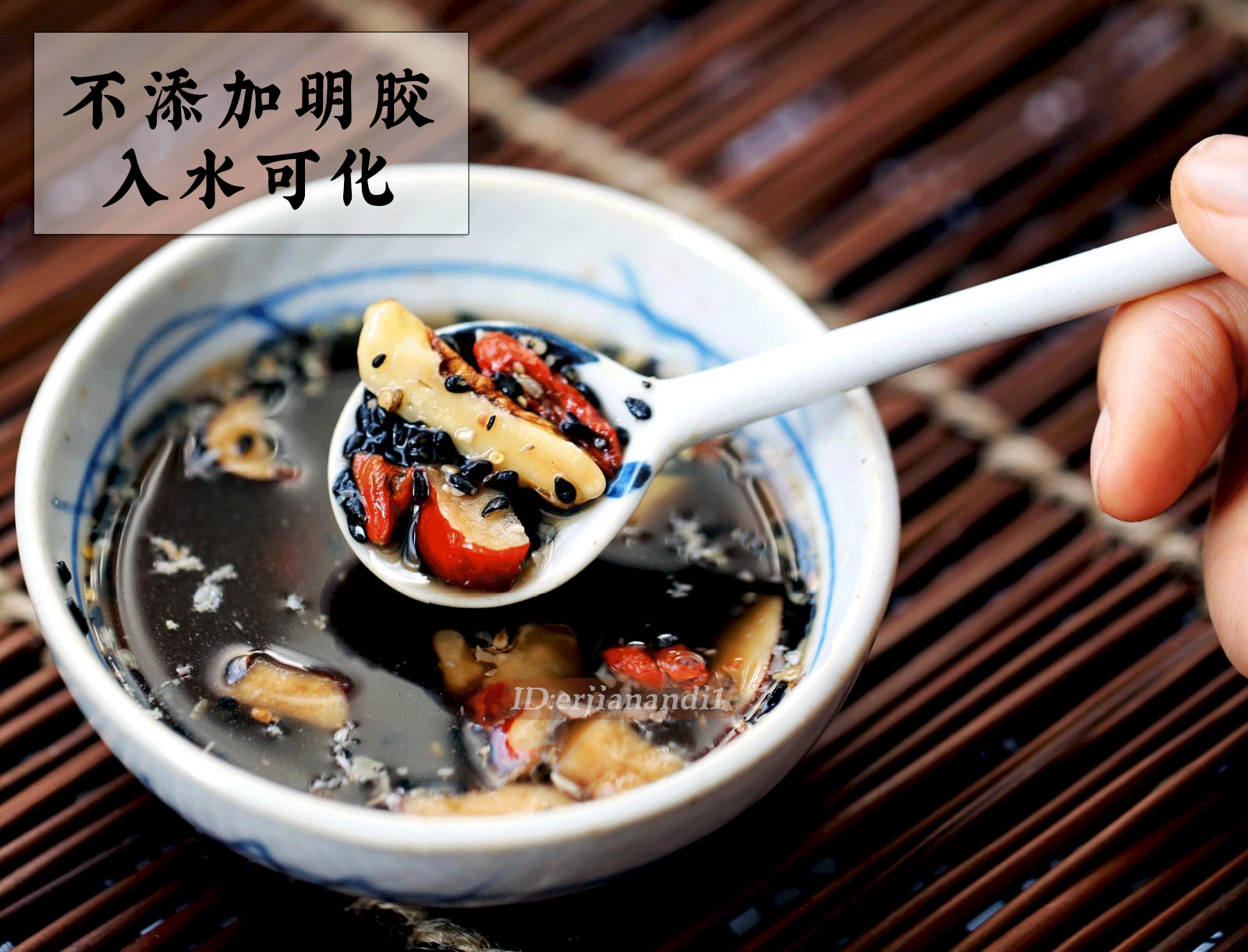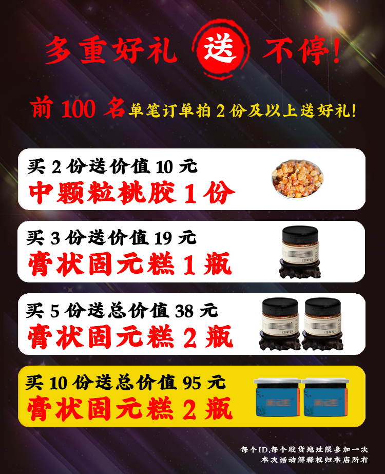 Donkey-hide gelatin, wolfberry, walnut, red dates, black sesame, rock sugar, longan, rice wine