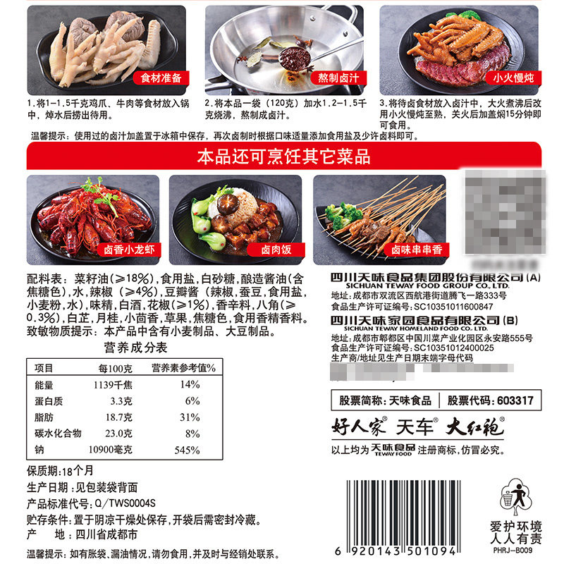 Rapeseed oil (≥ 1 8%) edible salt white sugar to brew soy sauce (with caramel color) Water chili (≥ 4%) Bean Petal Sauce (Pepper Silkworm Bean Edible Salt Wheat Flour) MSG White Pepper pepper (≥ 1%)