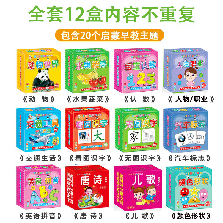 Full set of 12 boxes (2 rings per box) Animals (90 kinds) Fruits and vegetables (90 kinds) Recognition (0-100 kinds) Character Occupation (90 kinds) Daily necessities Traffic (90 kinds) Color shape (90 kinds) Car logo reading picture literacy nursery rhymes (45 songs) Tang poems (45 songs) Pinyin and English (90 kinds) Animal fruits Animal fruits animal fruit figures Animal fruit color shape animal fruits number living animal fruits recognition characters living animals fruits recognition characters traffic Color Buyer specifies 2 boxes (leave a message on the order) Buyer specifies 3 boxes (leave a message on the order) Buyer specifies 4 boxes (leave a message on the order) Buyer specifies 5 boxes (leave a message on the order) Buyer specifies 6 boxes (Leave a message on the order)