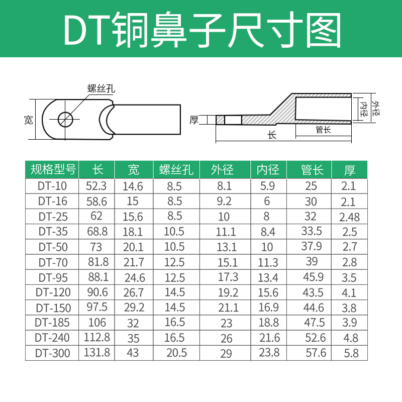 Red copper DT-10 squared copper nose line nose wiring terminal copper wire ear cable blocked oil copper joint wiring nose B-grade