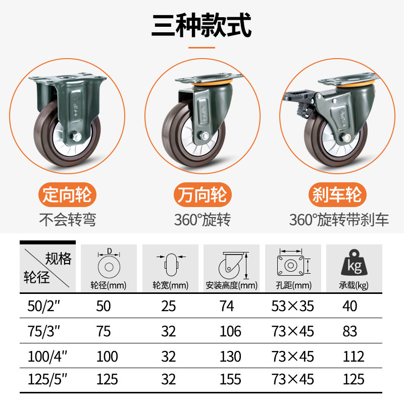 3-inch rubber directional wheel 3-inch rubber universal wheel 3-inch rubber universal brake wheel 4-inch rubber directional wheel 4-inch rubber universal wheel 4-inch rubber universal brake wheel 5-inch rubber directional wheel 5-inch rubber universal wheel