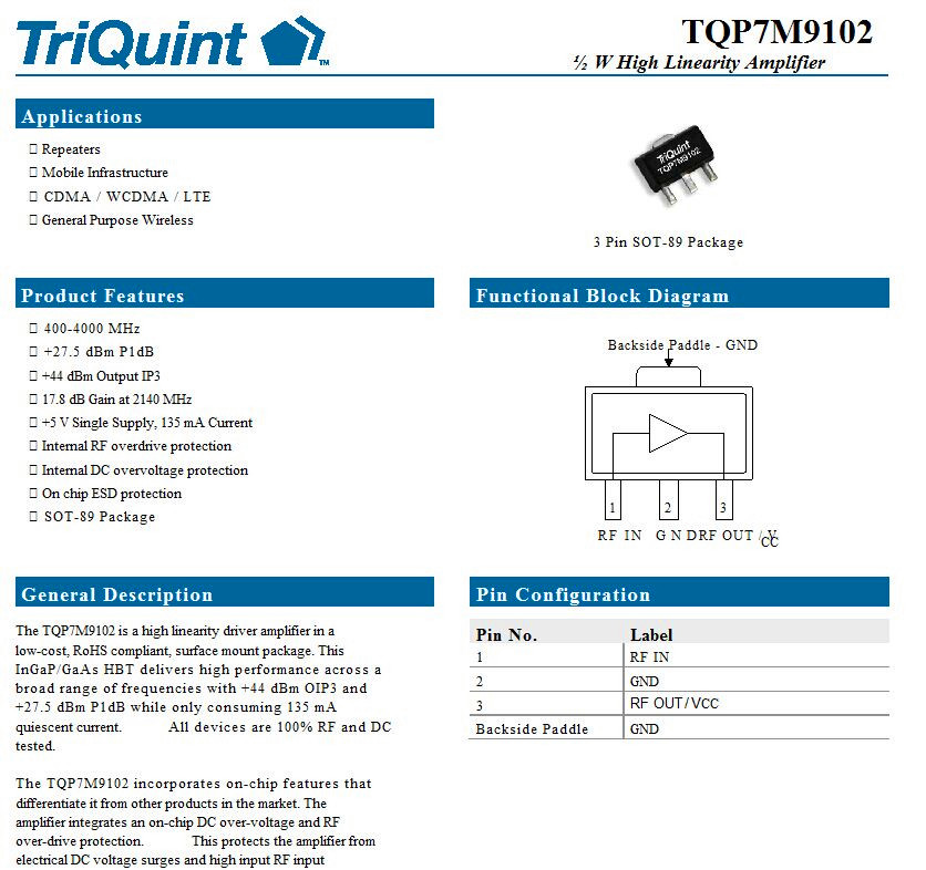 TQP7M9102 Screen printing 7M9102 SOT-89 0 5W High linear amplifier RF amplifier tube
